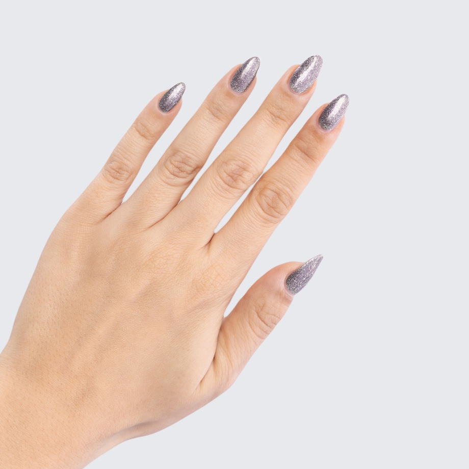 The metallic finish of this gunmetal-grey polish sets a shining example.